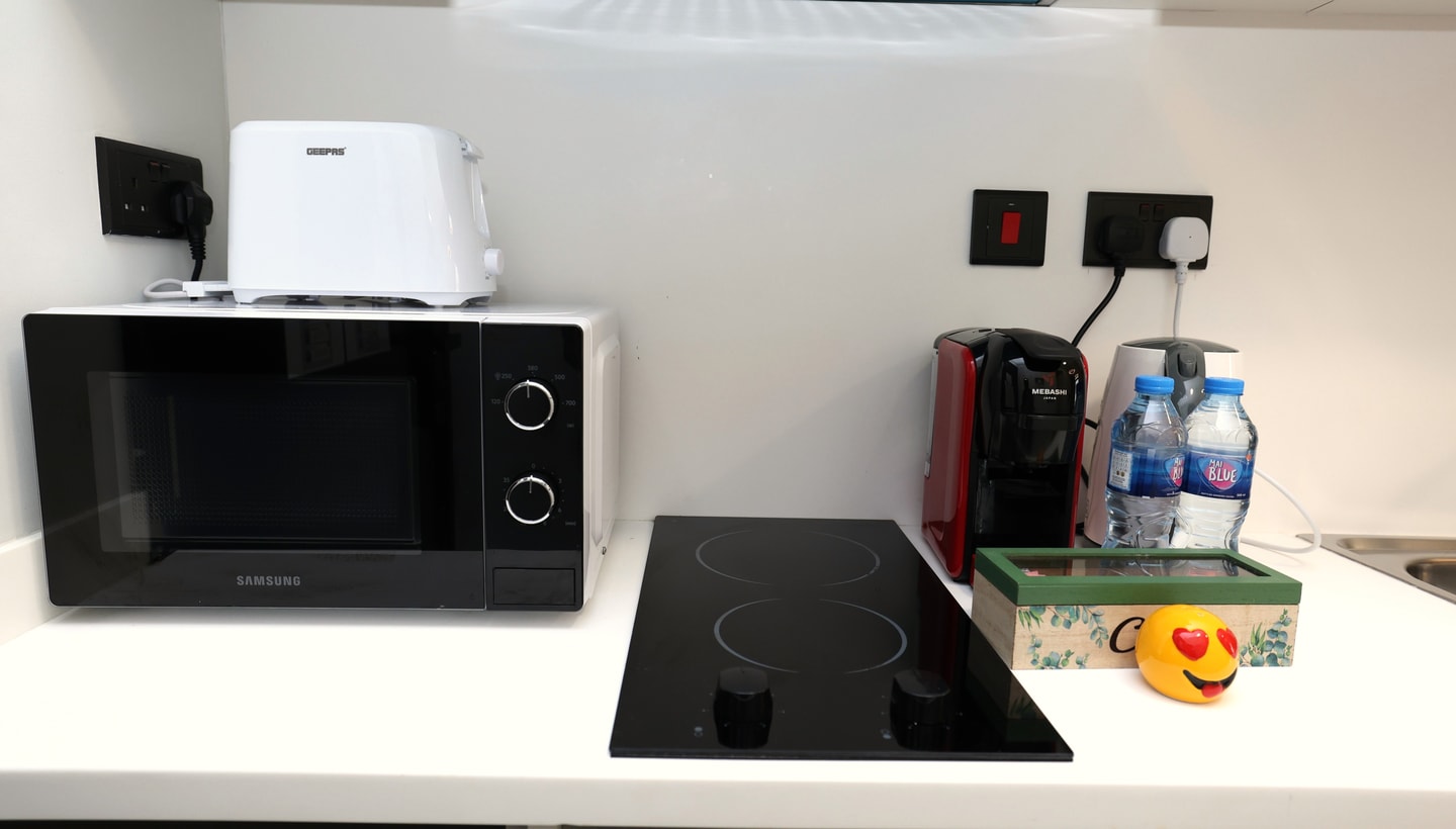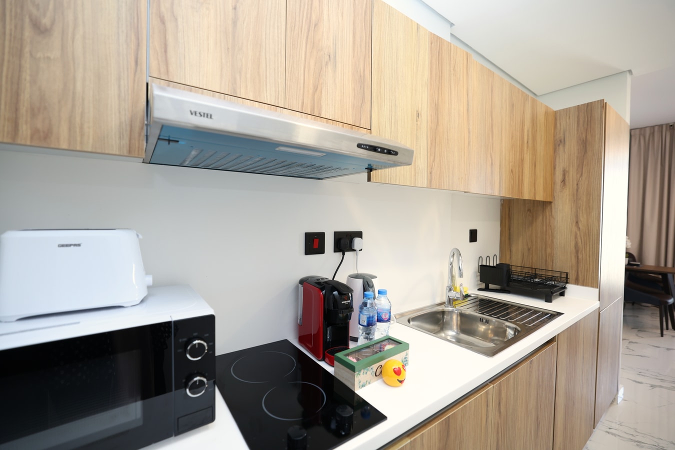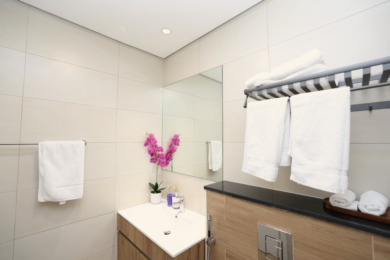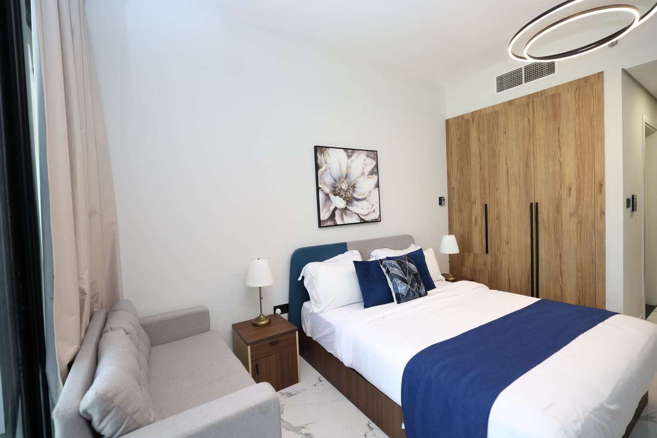 Guests can enjoy a range of premium amenities within the building, including an infinity pool, a well-equipped gym and 24/7 security.