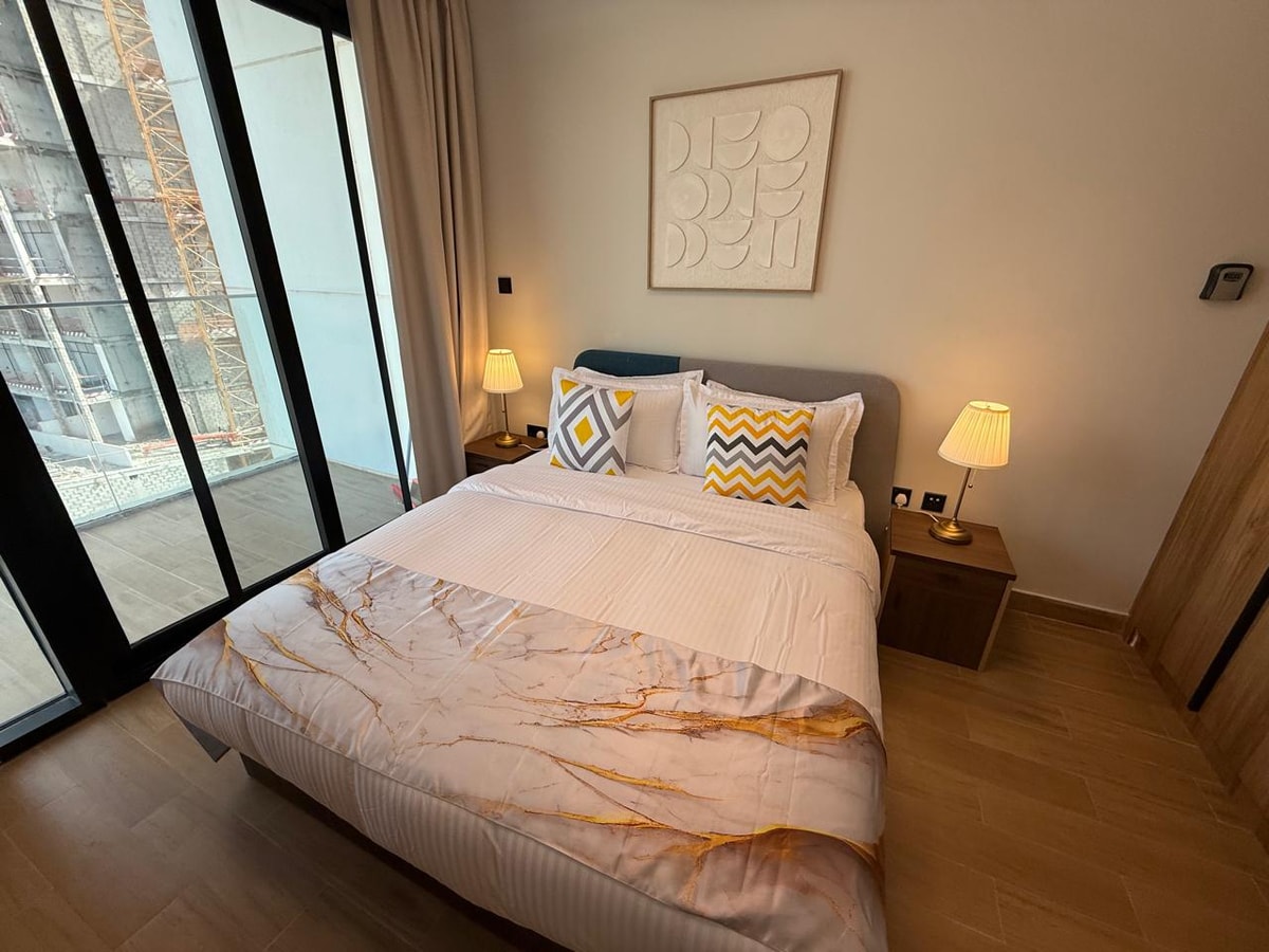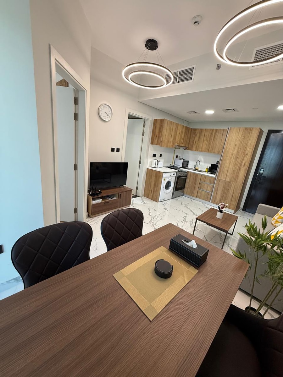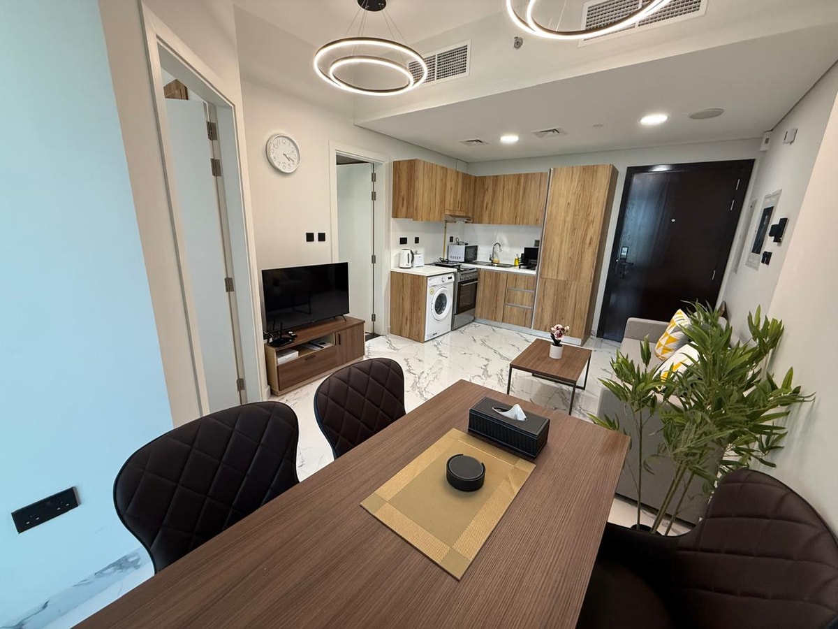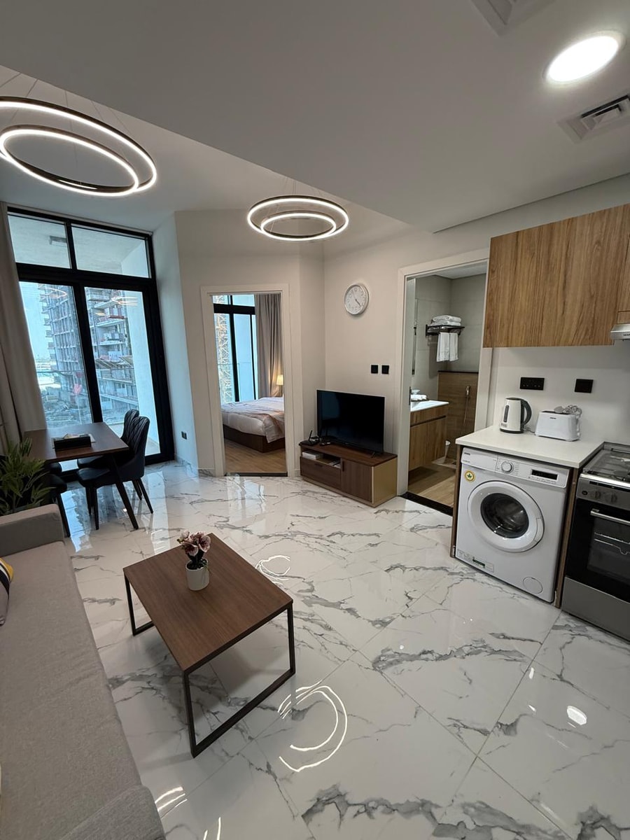 This stylish junior 1-bedroom apartment offers a beautifully designed layout with a fully separated bedroom, complete with a door for added privacy. The living area features a modern sofa, smart TV, and dining space, creating a welcoming atmosphere for relaxation or remote work. The fully equipped kitchen includes all the essentials for both short and extended stays, while the bathroom features sleek finishes and quality fixtures.